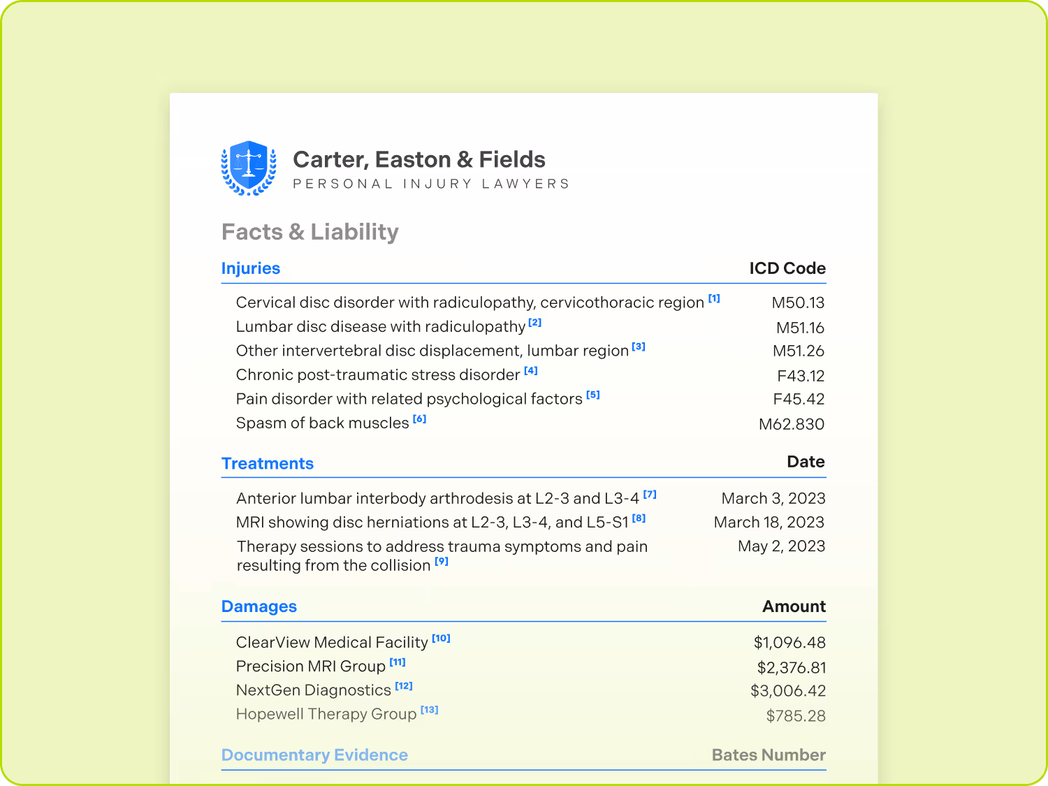 Manual review means missed details. Your AI legal team spots connections between symptoms and treatments that people often overlook, uncovering potential undiagnosed injuries and treatment gaps. Your AI legal assistant processes thousands of pages in seconds, finding needles in haystacks that strengthen your case. Firms using Supio are seeing higher settlements simply because they're catching things that used to slip through the cracks.