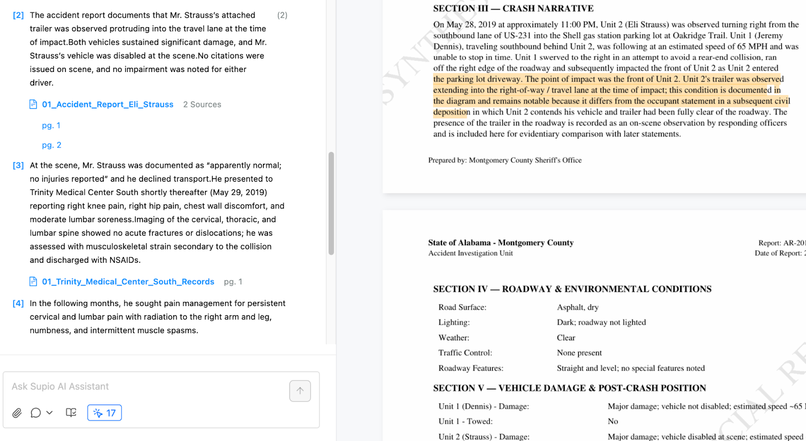 Analyze police reports, witness statements, dashcam footage, and depositions to surface inconsistencies, admissions, and the strongest liability narrative.