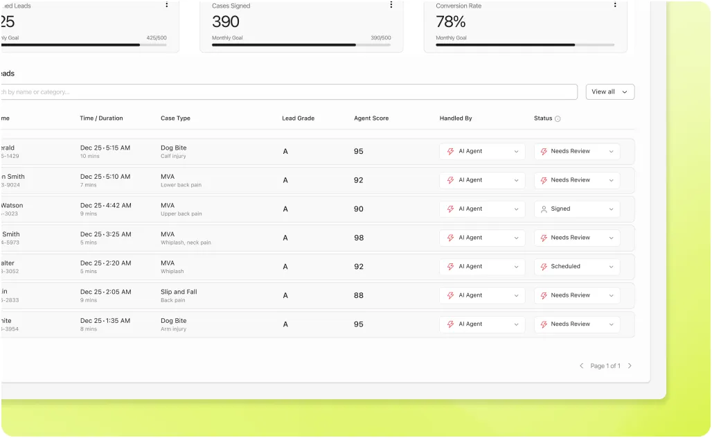 - The Voice Agent captures leads 24/7, the Scoring Agent qualifies and prioritizes cases automatically, and the Coaching Agent ensures your team closes at peak performance on every call.