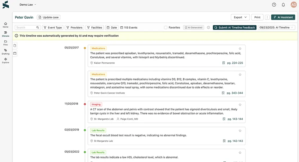 - In-depth medical chronologies: complete, sourced, built for trial and mass tort strategies